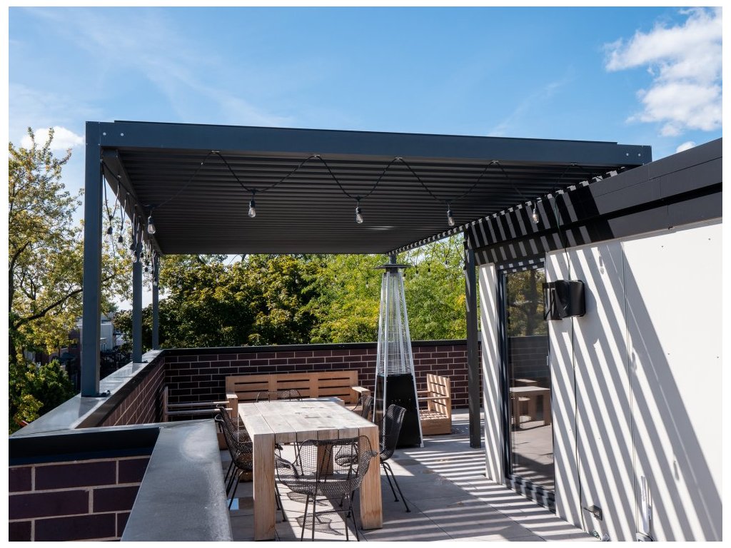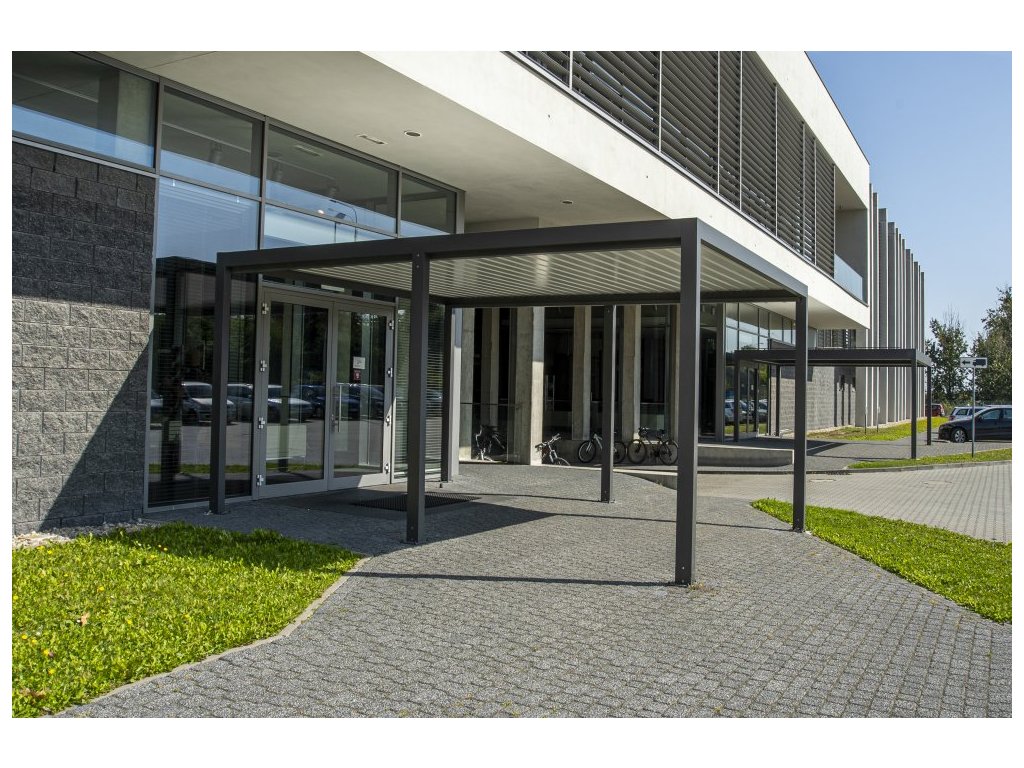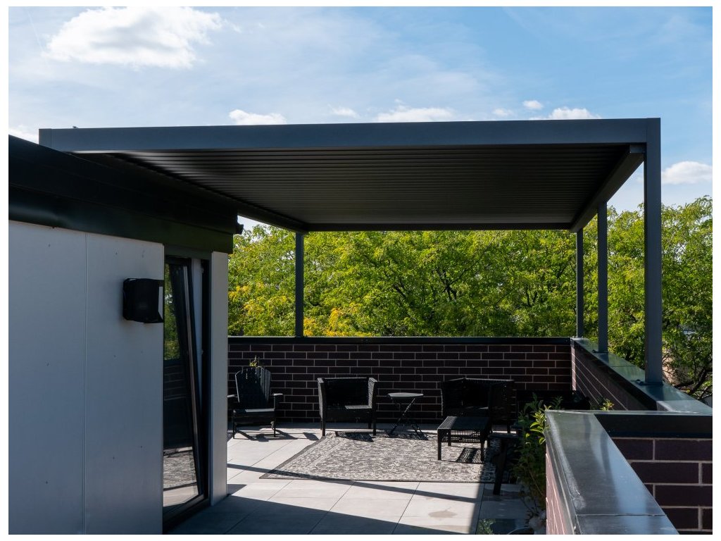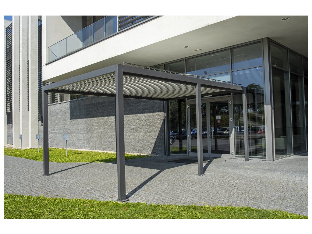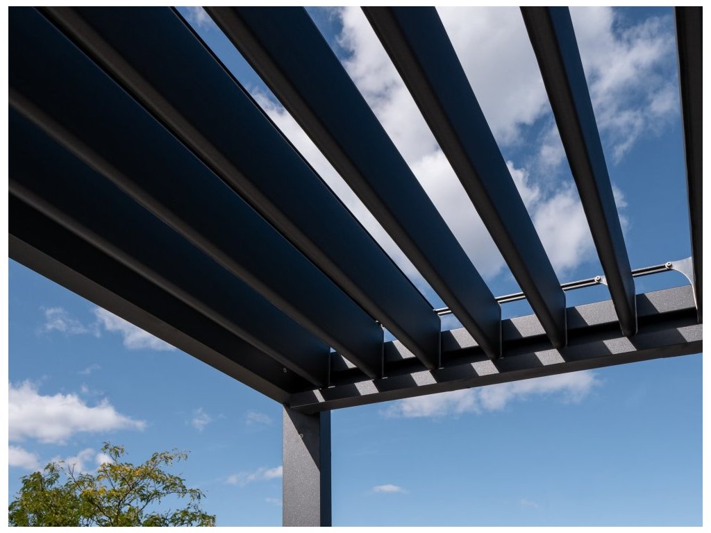 Střecha bioklimatické pergoly sestává z otočných lamel, které poskytují ochranu před nepříznivým počasím a současně umožňují regulaci stínění nebo odvětrávání přehřátého vzduchu.