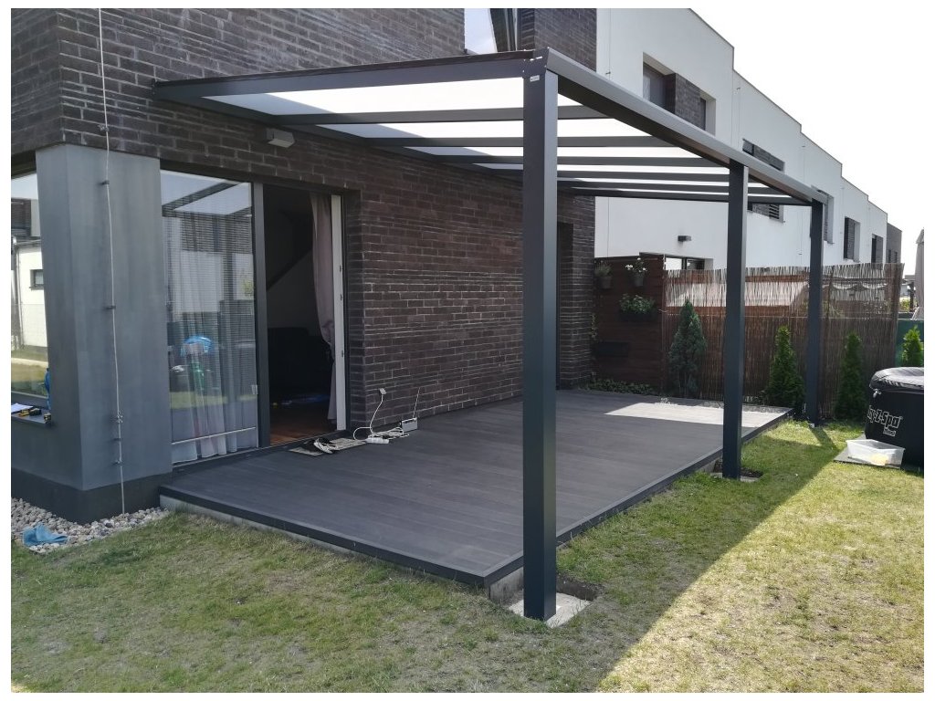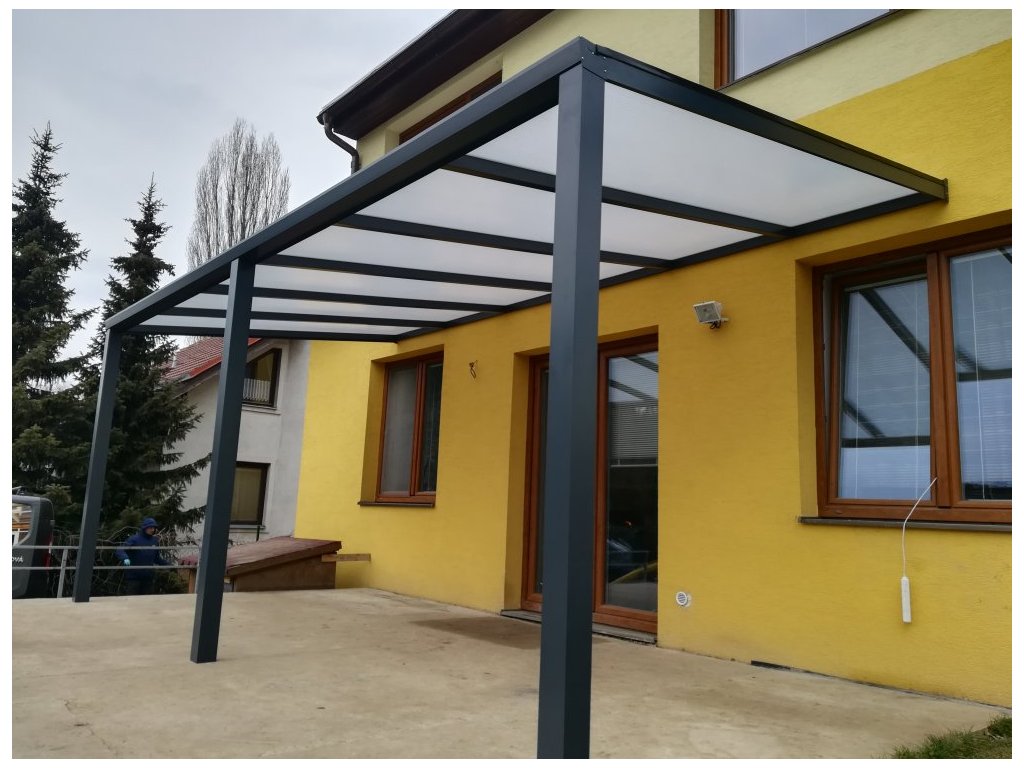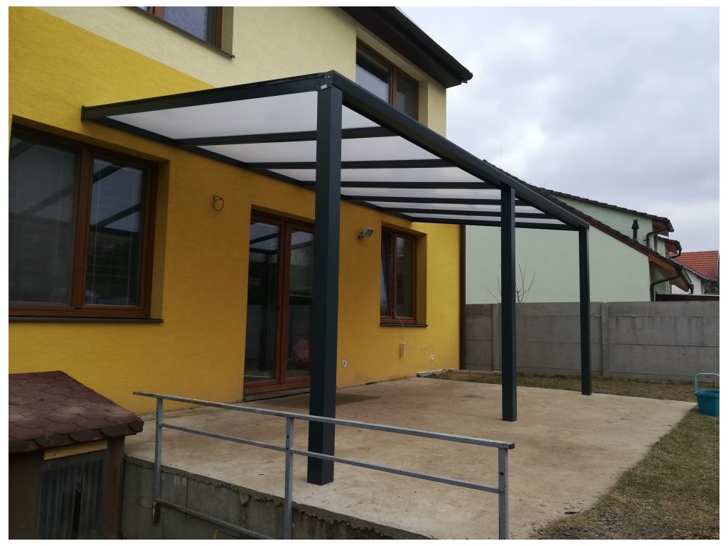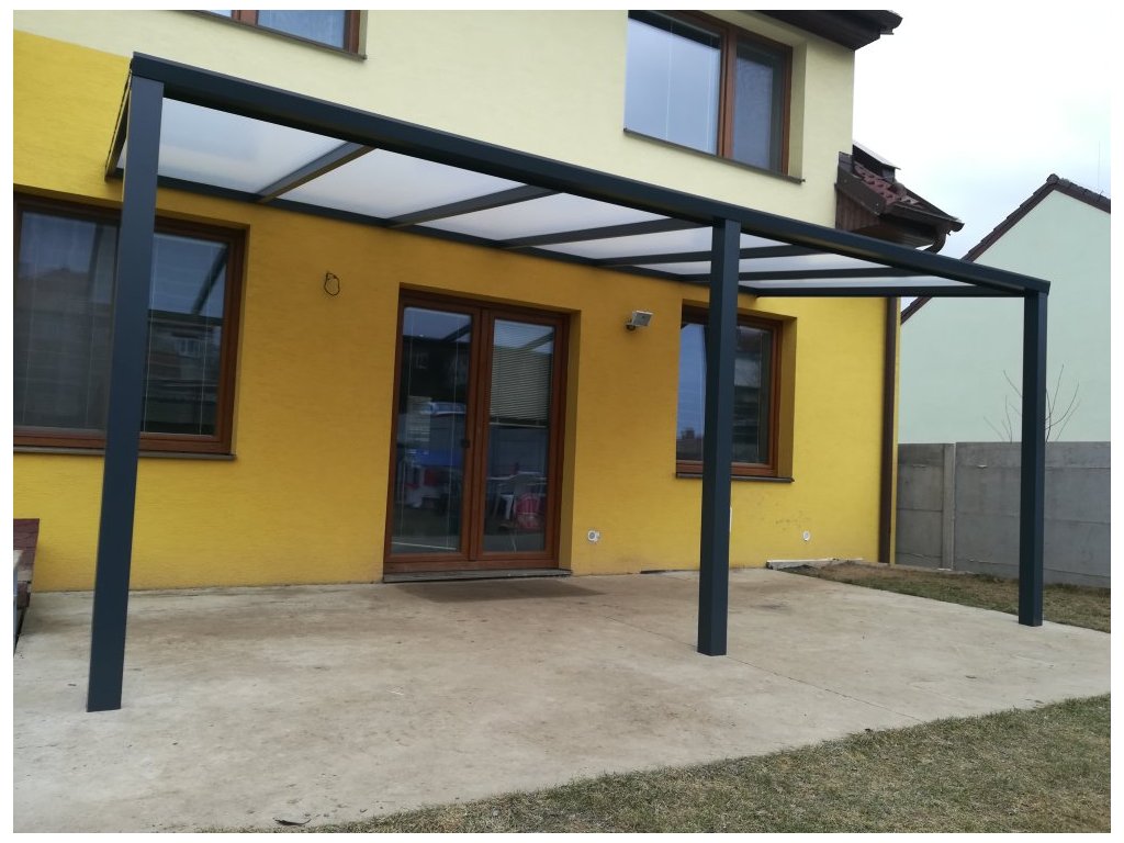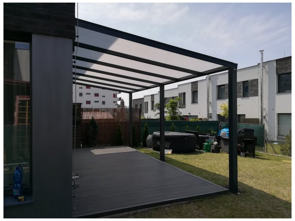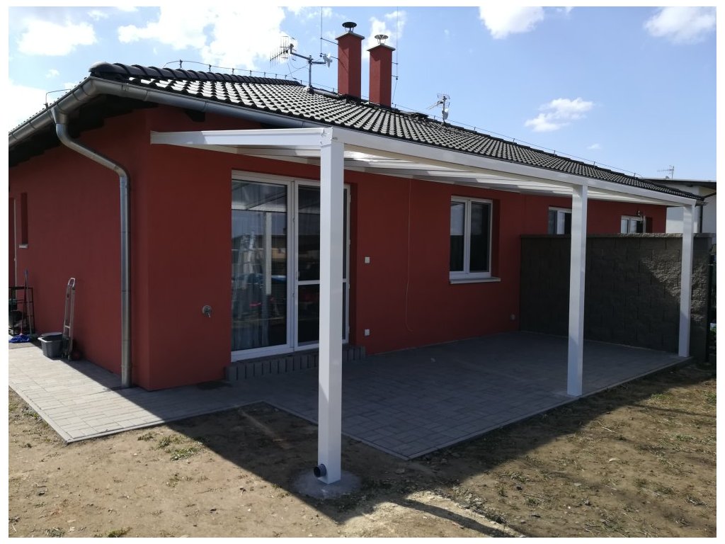 - V přední části integrovaný okap s možností svodu vody v nosném sloupu případně trativodem pod pergolou.
