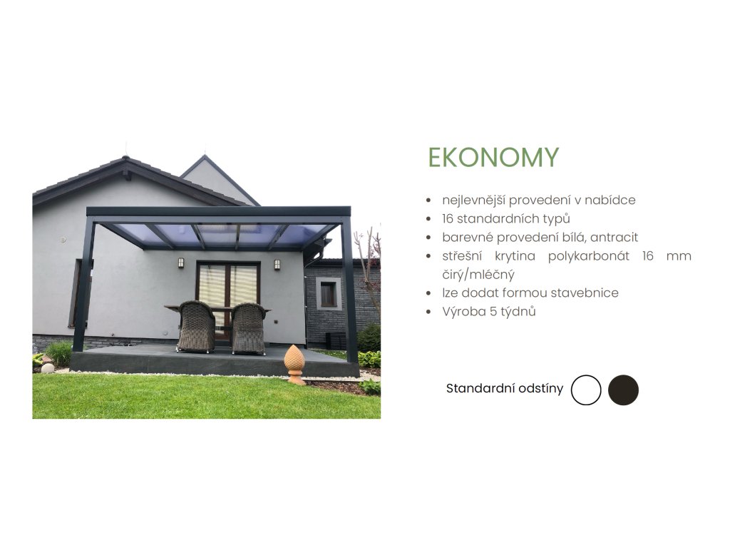 Představujeme vám cenově dostupné řešení pro vaše zastřešení terasy! Hliníkové pergoly řady EKONOMY jsou nejlevnějšími pergolami na trhu. S jejich elegantní konstrukcí z odolného polykarbonátu nabízejí dlouhou životnost a odolnost. Tyto pergoly jsou ideální pro oblasti s nízkým sněžným pásmem a jsou k dispozici v dekorech bílá (RAL 9010) a antracit (RAL 7016), které skvěle doplní váš exteriér.